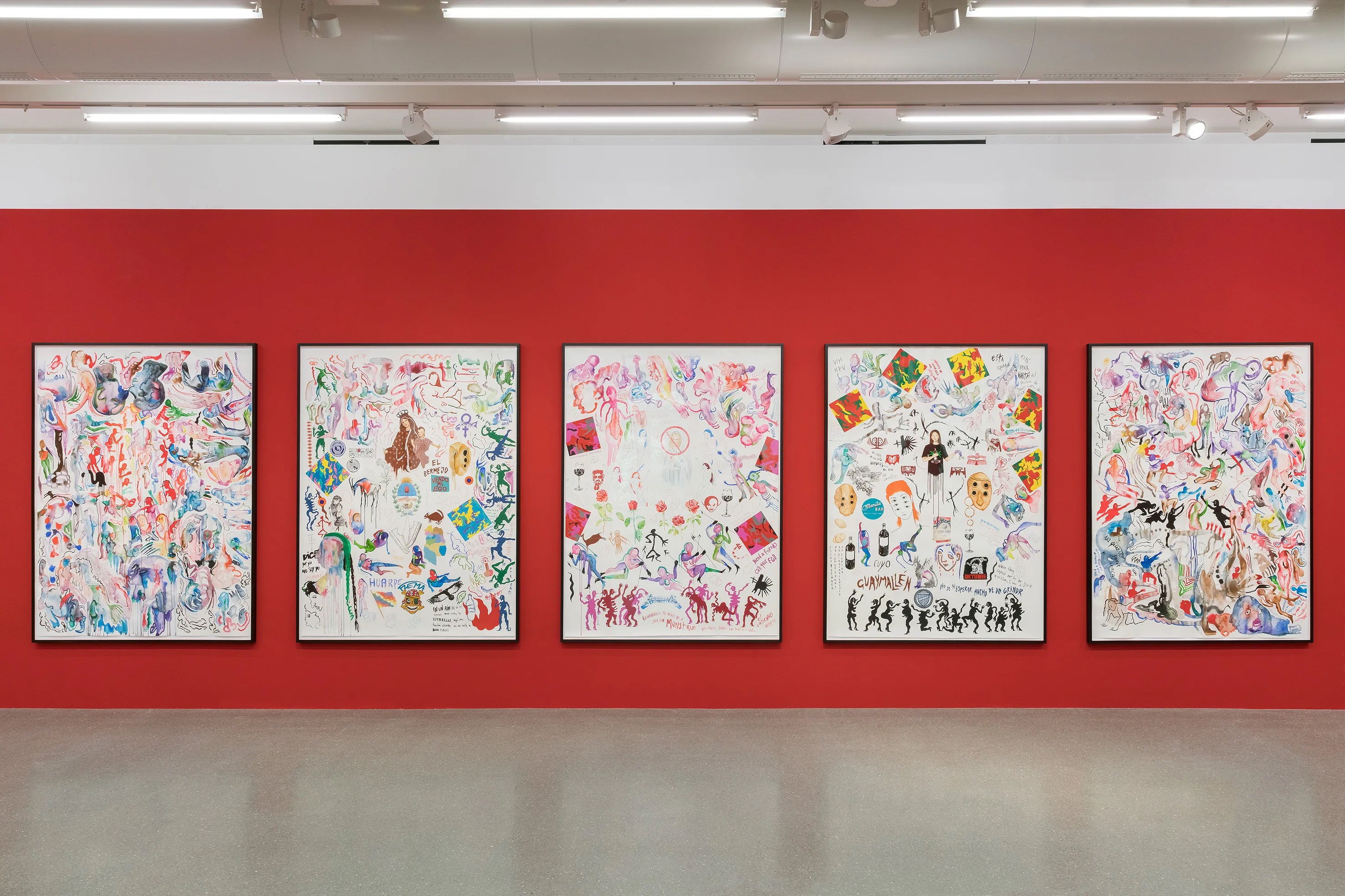 Watercolor's reputation as a "light" or secondary medium-fit for travel studies and preparatory thought-has long mirrored entrenched hierarchies of material value. Obdurate oil and metal have traditionally signified seriousness; translucency and stain, the minor key. Poblete flips that script. In her hands, the bleed, bloom, and capillarity of pigment in water become structural, not incidental. The sheet does not illustrate the world; it models how the world-bodies, icons, memories-moves through contact and change.